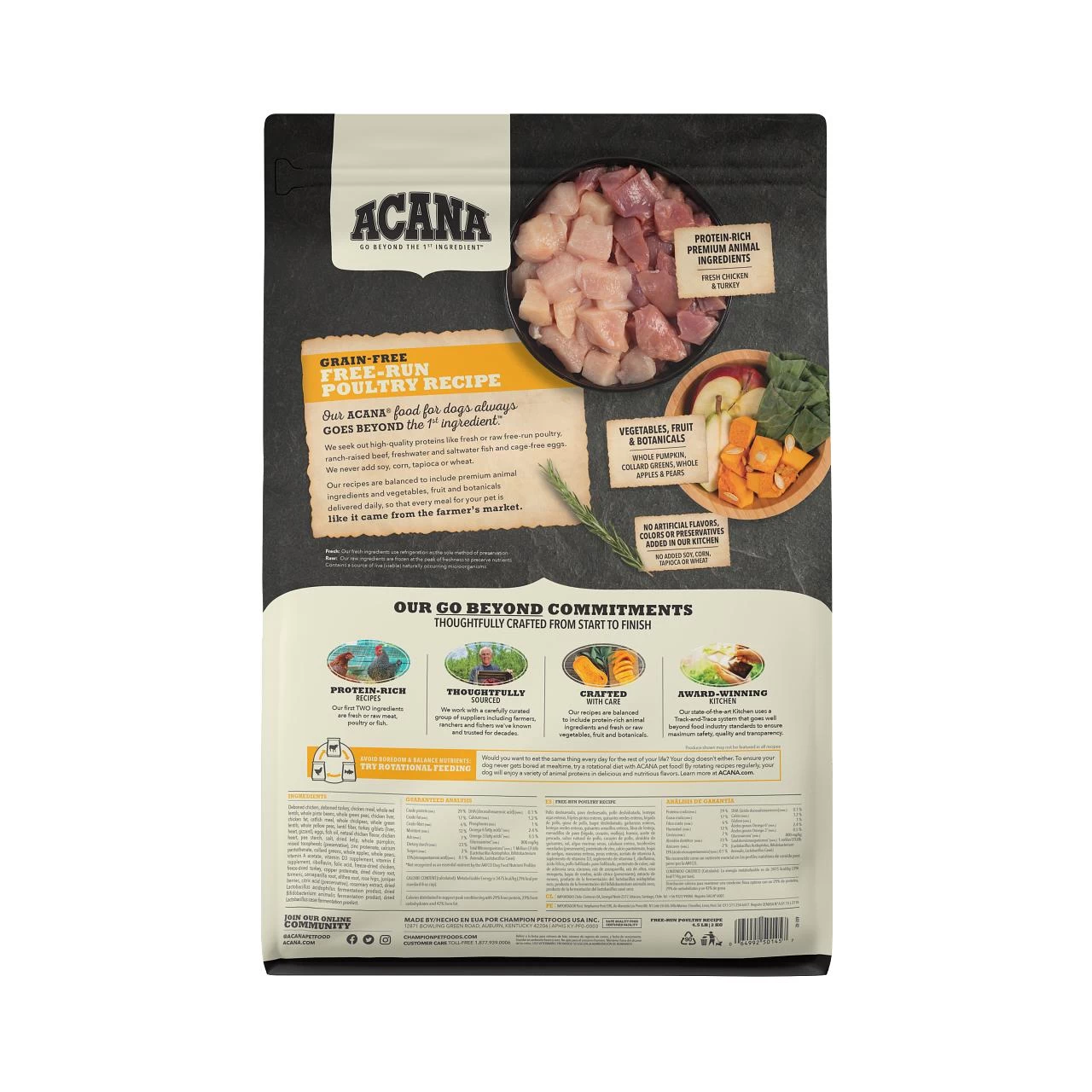 Our ACANA® foods always goes beyond the 1st ingredient, thoughtfully crafting our recipes from start to finish. ACANA® Free-Run Poultry recipe is balanced with 60%* quality animal ingredients like free-chicken and turkey, cage-free eggs, and 40%+ fruits, vegetables, and botanicals. Artificial colors, flavors or preservatives are never added in our kitchen.