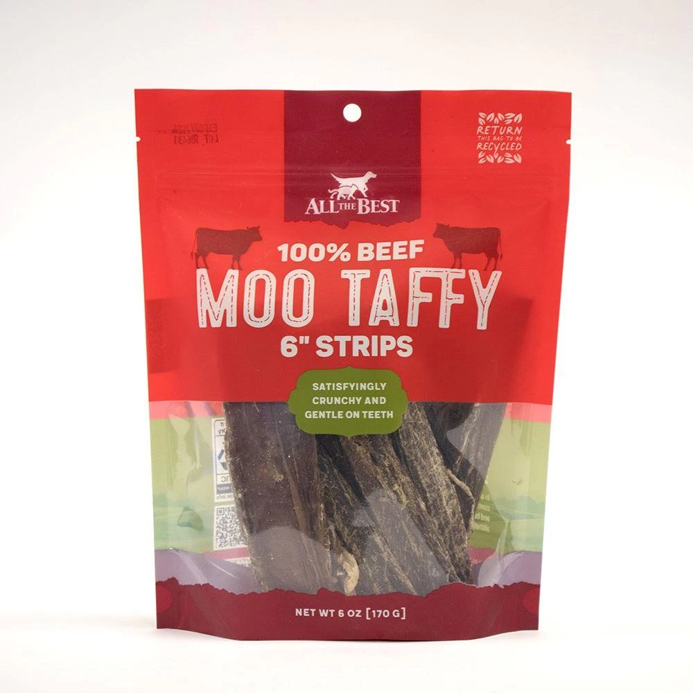 All The Best Moo Taffy is a satisfyingly crunchy and chewy treat. Made of 100% beef, it’s a healthy, carb-free option that’s great for dogs with food sensitivities.
