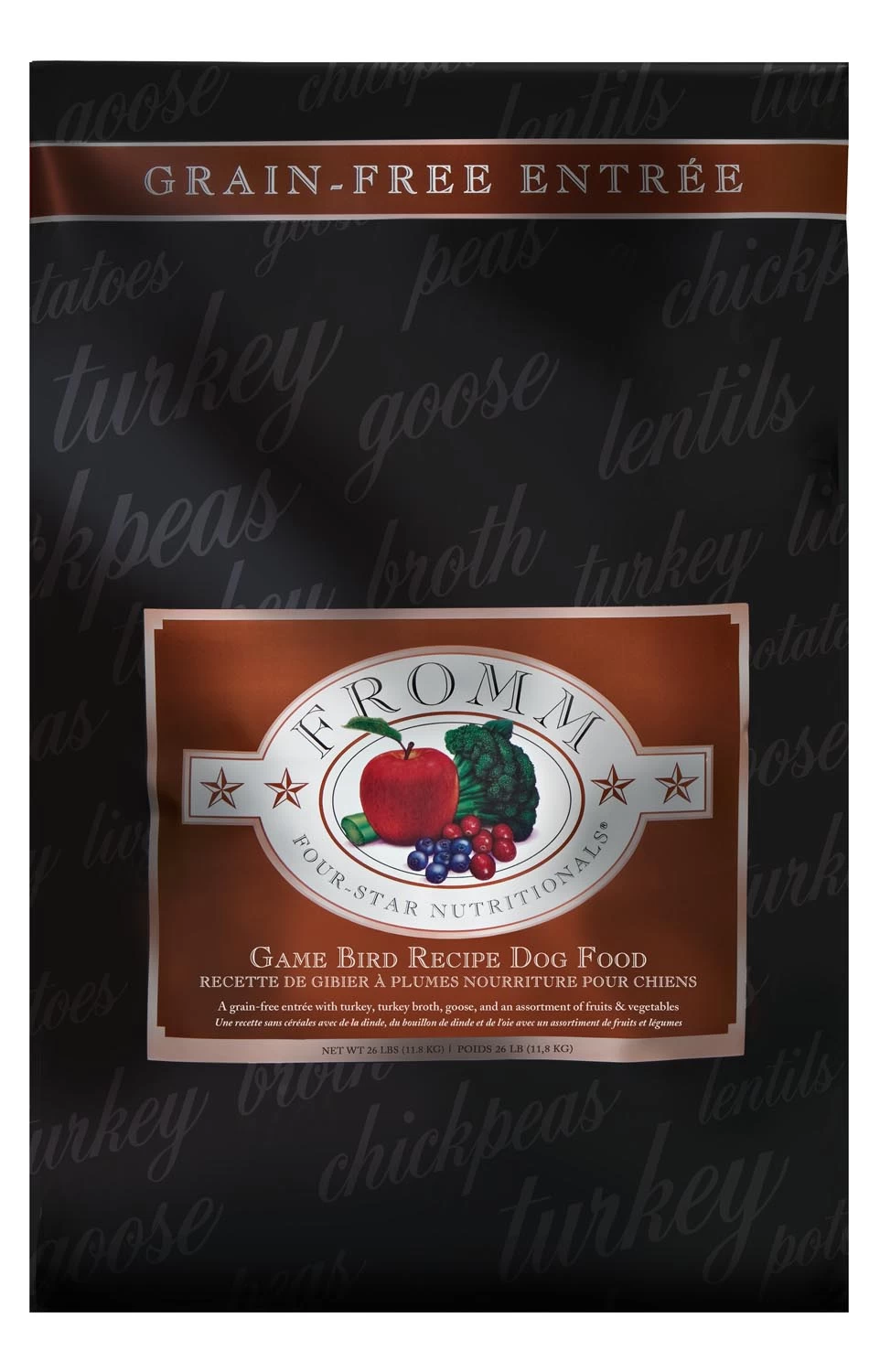 Fromm Four-Star Game Bird Recipe Dog Food is a grain-free blend of turkey, turkey broth, goose, and an assortment of fruits and vegetables. This distinctive blend is specially prepared to ensure consistency, quality, and superior taste in each and every bowl. Game Bird Recipe provides complete and balanced nutrition for dogs of all ages and can be alternated with other Fromm Four-Star recipes.