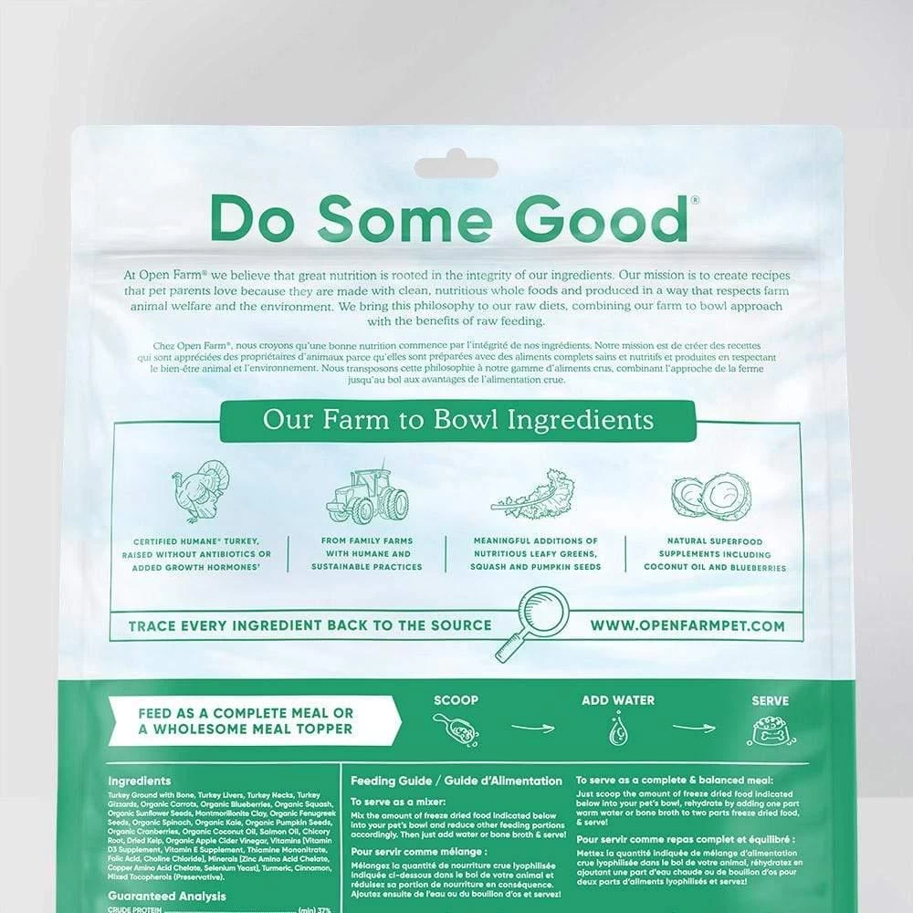 Easy to serve and easy to please. This high protein topper or complete meal is packed with humanely raised antibiotic-free raw turkey. For added nutrition, Open Farm includes functional ingredients like locally sourced leafy greens, squash and pumpkin seeds, superfoods like coconut oil, and antioxidants like blueberries.