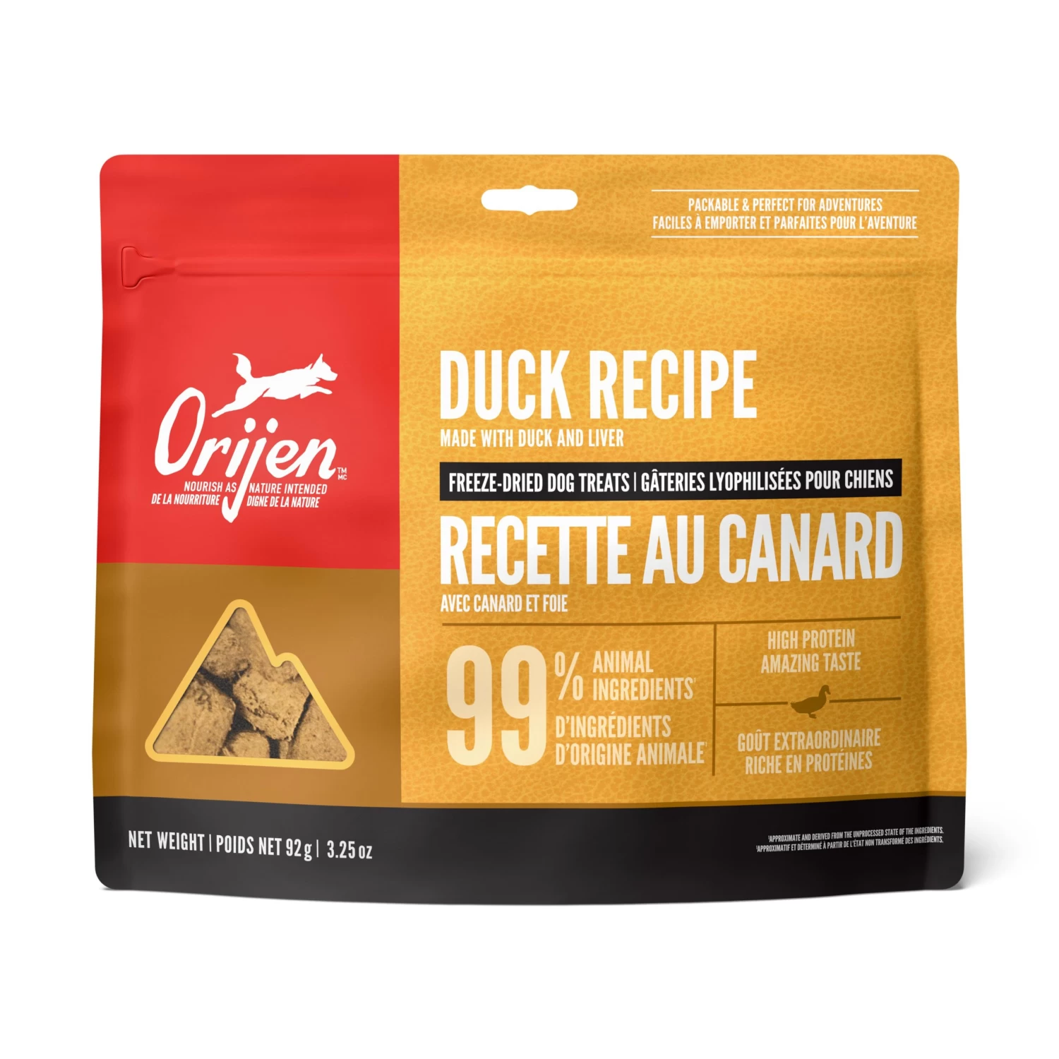 Treat your dog to delicious and nutritious ORIJEN® Freeze-Dried Treats. Packed with animal protein, our Duck Recipe is made with 99%* animal ingredients including nourishing duck and liver. Freeze-dried to lock in their rich nutrients and flavour, they’re packable and perfect for adventures. At just six calories each, ORIJEN Freeze-Dried Treats are loaded with protein and amazing taste.
