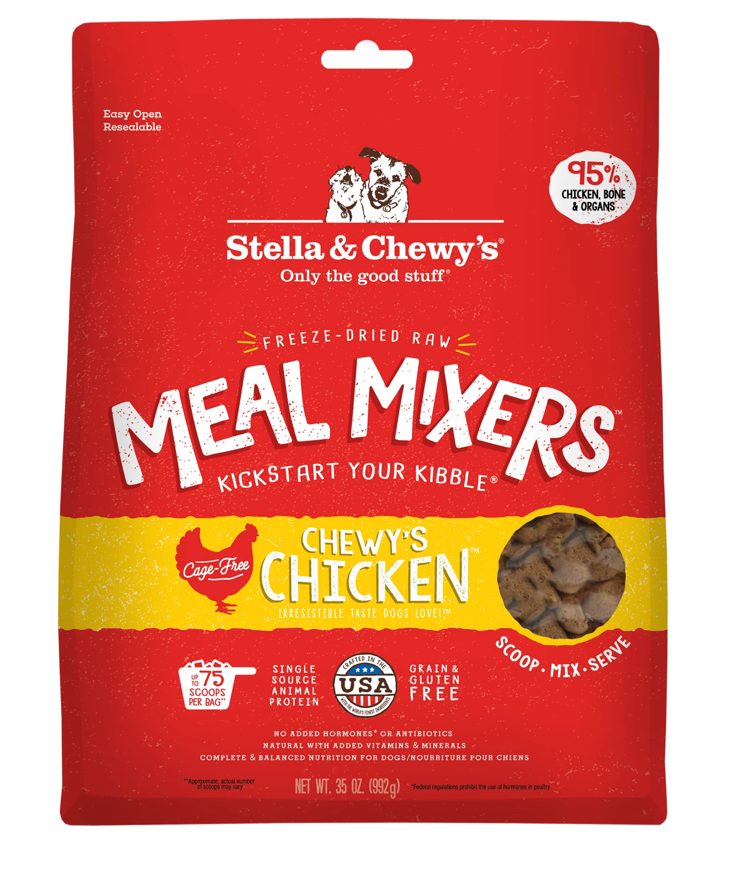 Kickstart your kibble with these Chewy’s Chicken Meal Mixers (35 oz offering), delivering a boost of raw and irresistible taste! One simple scoop is all it takes to turn your dog’s everyday kibble into awesome raw nutrition. Simply scoop, mix-in and watch your dog go crazy for mealtime!