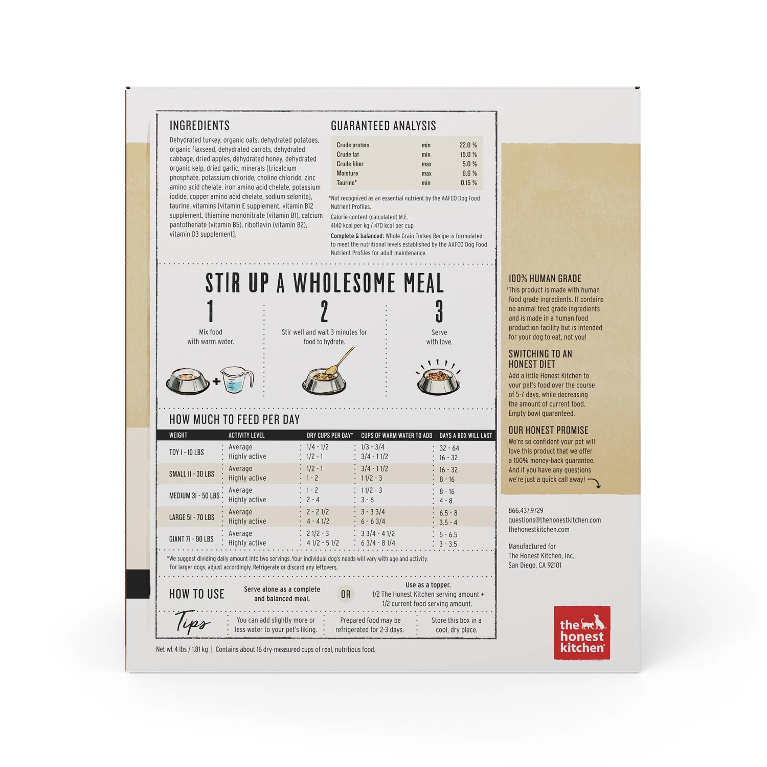 The Honest Kitchen believes human grade, whole foods provide pets the best nutrition possible. This whole grain recipe is made with uncompromising quality control standards using real, whole food ingredients that are gently dehydrated to maintain nutrients & taste. To meet our human grade standard, we use the same whole foods you’d recognize in your own kitchen, and make this recipe in a human food facility. Just add warm water and wait three minutes for a tasty, homemade meal that you and your pets will love!