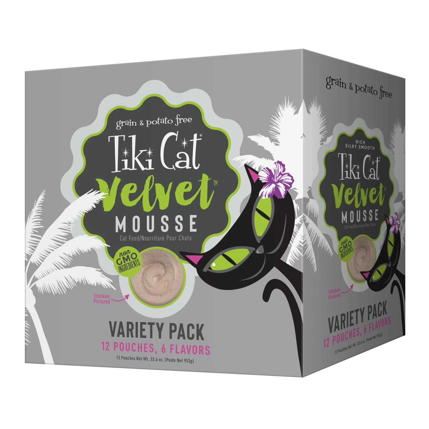 Tiki Cat® Velvet⢠Wet Cat Food features silky-smooth mouse blends of fish or chicken for the most finicky felines.