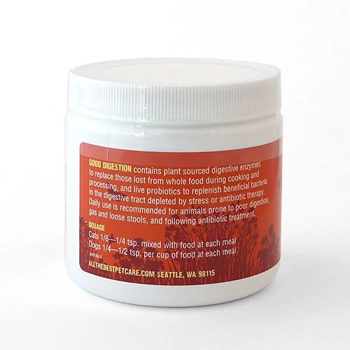 Combines digestive enzymes with probiotic cultures, fructooligosaccharides (FOS), and alfalfa, barley, and wheatgrass to address the very common problem in dogs and cats of poor digestion, gas, and loose stools, whether they’re the result of antibiotic therapy, poor diet, or inherited digestive weakness. Good Digestion repopulates the intestinal tract with beneficial bacteria, which in turn help to break down and assimilate the nutrients in food. Good Digestion is a must after a course of antibiotic treatment.